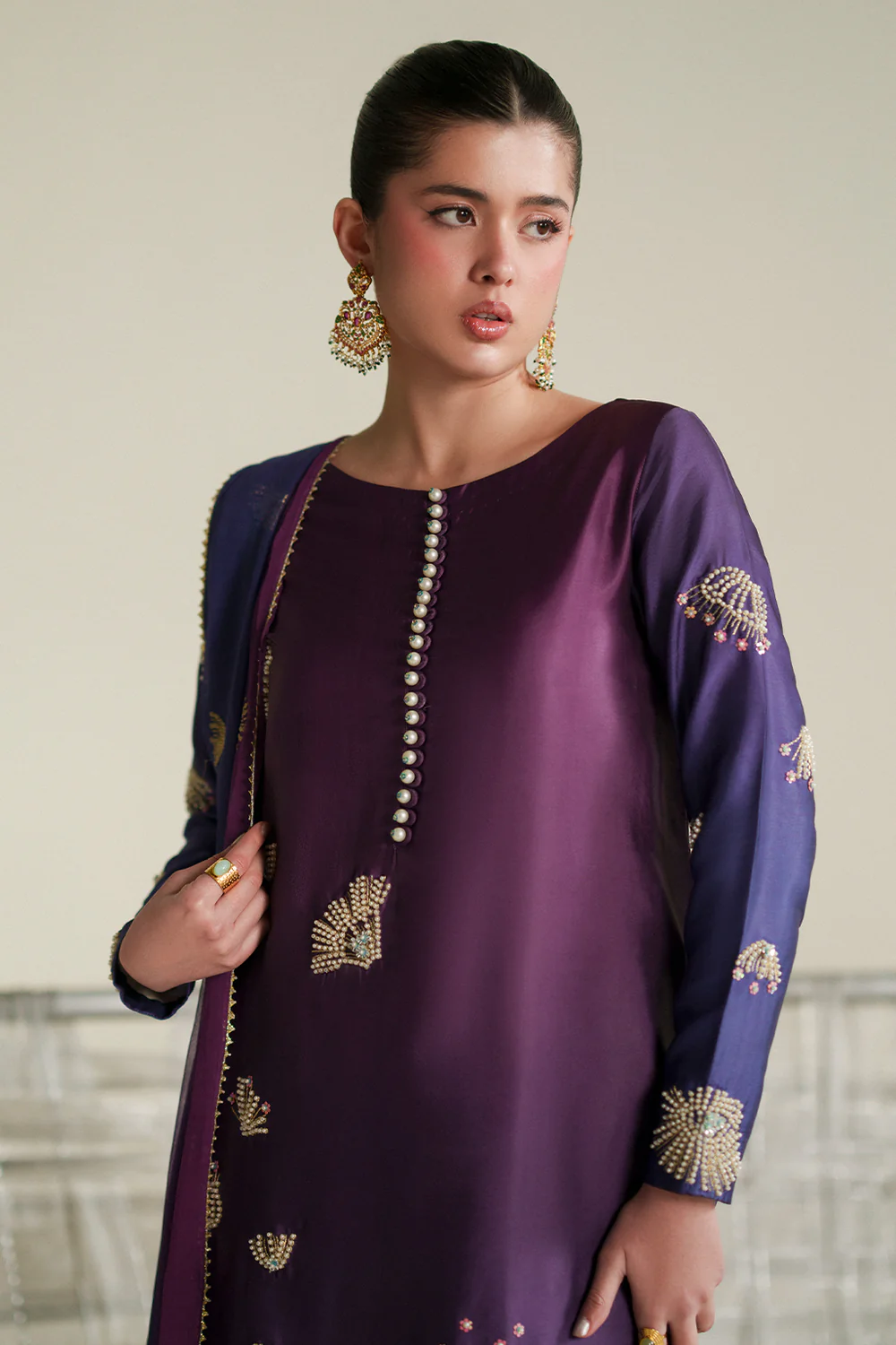 A classy and delicate silk long shirt intricately detailed with hand embellishments paired with plain trousers and a printed chiffon dupatta.